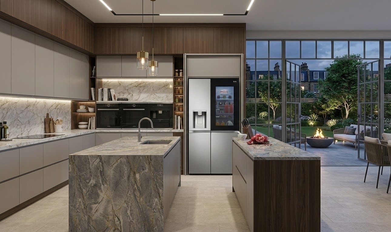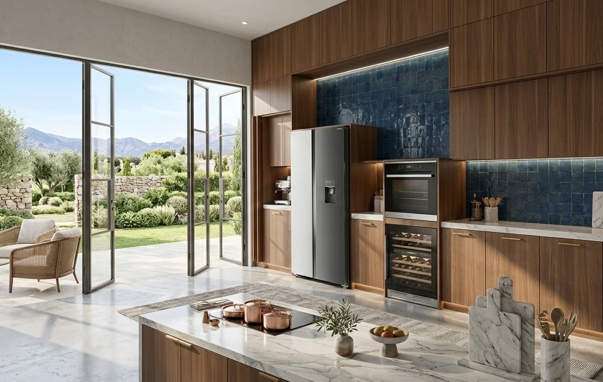 Cozinhas contemporâneas valorizam a combinação de funcionalidade e design, e uma geladeira Side by Side com acabamento refinado e tecnologia inteligente se torna uma peça central, capaz de transformar o espaço em um ambiente moderno, organizado e eficiente.